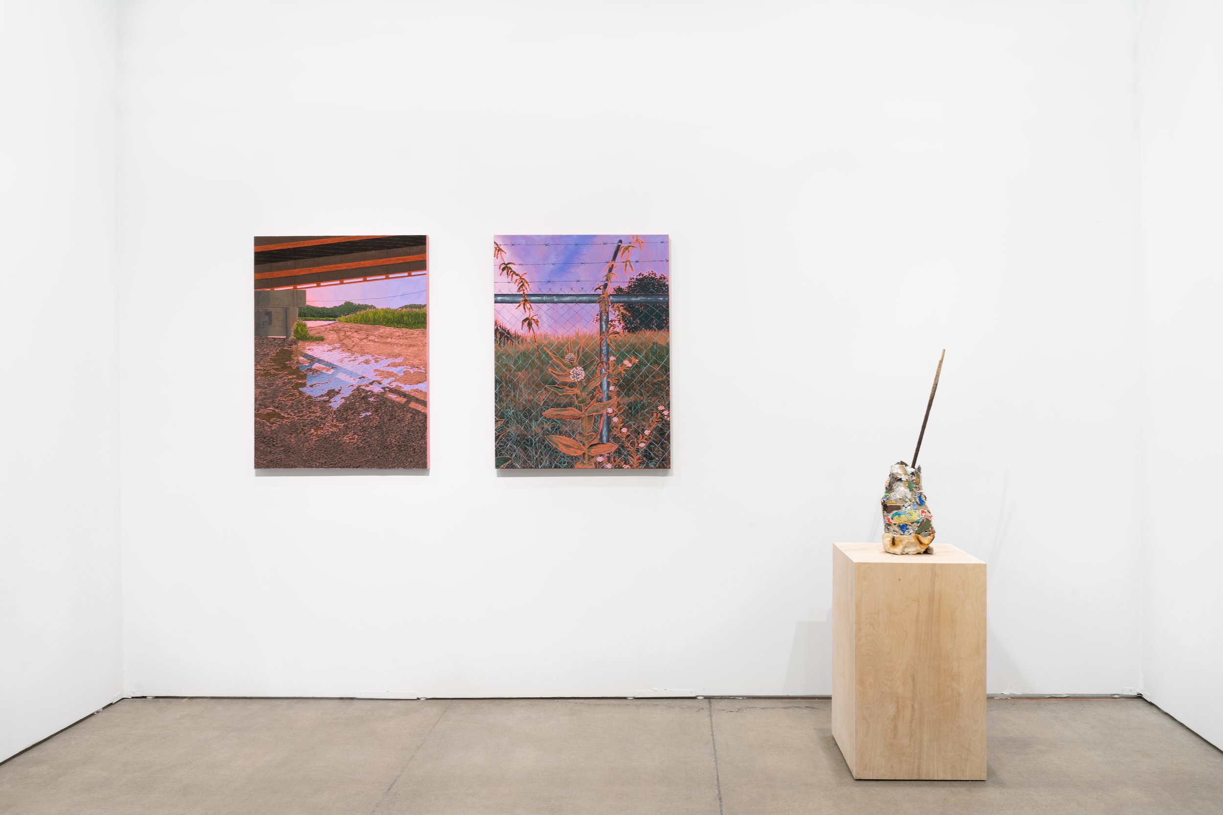 Rooted in the exploration of landscape and its resources, their practice is informed by a primary residence in the southwest and seasonal movement across the United States. The work in this presentation depicts forgettable places of transition, pests or agitators, and scum - the layer of dirt on top of liquid. With or without discernable boundaries, scum is a breeding ground and a site of possibility. These transitional spaces and what brews there become a metaphor for resilience, and for what survives in the face of our changing social, political, and increasingly militarized environment. Additionally, their focus on water, or its scarcity, is a direct examination of the harsh realities of residence in the arid climate of the southwest.