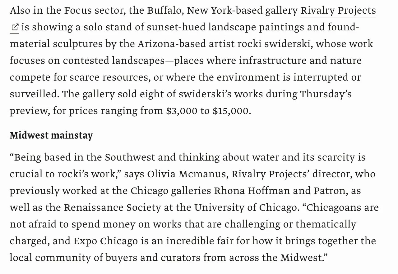 “Being based in the Southwest and thinking about water and its scarcity is crucial to rocki’s work,” says Olivia Mcmanus, Rivalry Projects’ director, who previously worked at the Chicago galleries Rhona Hoffman and Patron, as well as the Renaissance Society at the University of Chicago. “Chicagoans are not afraid to spend money on works that are challenging or thematically charged, and Expo Chicago is an incredible fair for how it brings together the local community of buyers and curators from across the Midwest.”