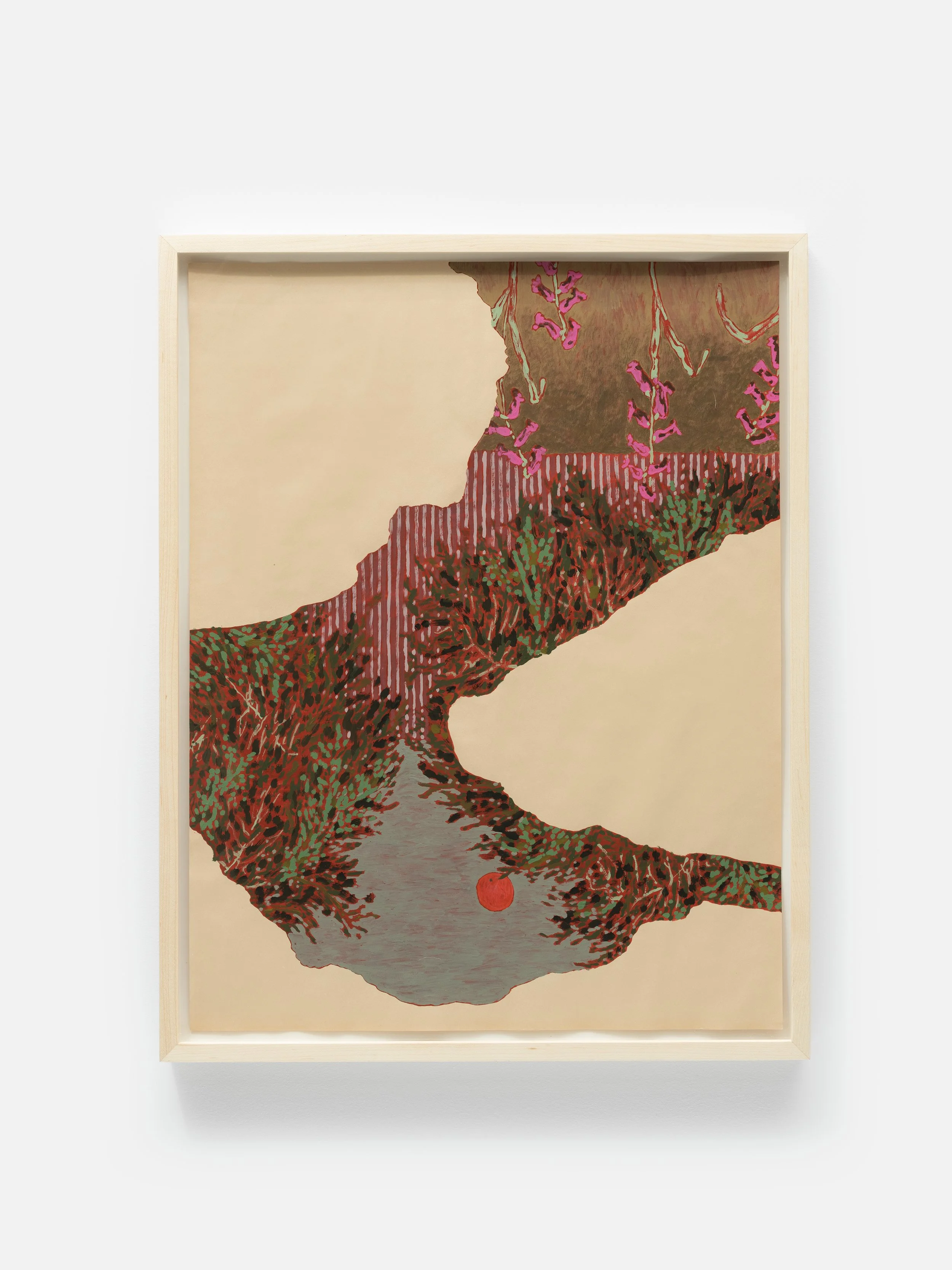 caption: rocki swiderski, red puddle, 2025. Acrylic and gouache on paper, 25 3/8 x 19 3/8 inches, 27 1/4 x 21 3/8 x 1 3/4 inches, framed. Courtesy of the artist and Rivalry Projects.